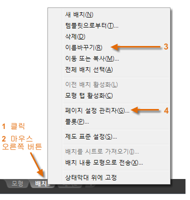 배치 탭에 액세스할 때는 먼저 (1) 해당 탭을 마우스 오른쪽 버튼으로 클릭한 다음 (2) 탭 이름을 (3) 배치 1보다 구체적인 이름으로 바꿔야 합니다. D-크기 배치의 경우 ARCH D 또는 ANSI D가 좋은 선택일 수 있습니다.
