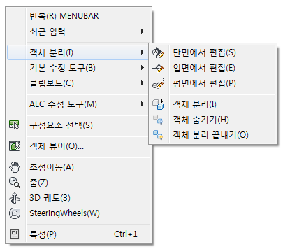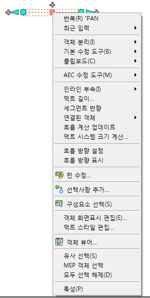 도면 영역에서 마우스 오른쪽 버튼을 클릭하면 현재 선택한 객체에 따라 다른 상황에 맞는 메뉴가 표시됩니다. 예를 들어, 하나 이상의 덕트 객체를 선택한 경우 덕트에 대한 상황에 맞는 메뉴가 다음과 같이 표시됩니다.