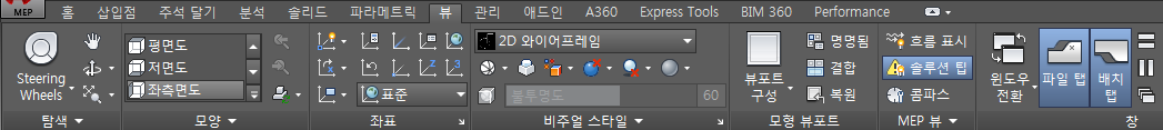 - 탐색. ViewCube 및 SteeringWheels, 초점이동, 줌 및 궤도 명령이 포함되어 있습니다.