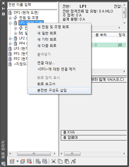 회로 관리자를 사용하여 현재 도면에서 분전반 구성도를 생성하려면
