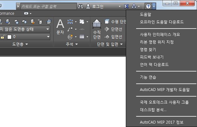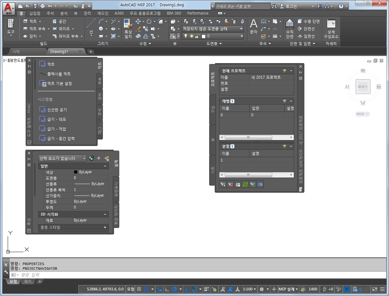 작업공간은 M/E/P 프로젝트 설정, 설계 작성 및 시공 도서 생성에 사용하는 리본, 도구 팔레트 및 기타 컨트롤이 포함된 도면 창으로 구성됩니다.