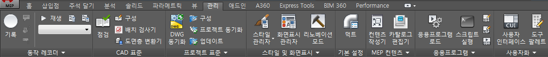 관리 탭에서는 고급 사용자 및 CAD 관리자용 기능을 찾을 수 있습니다.