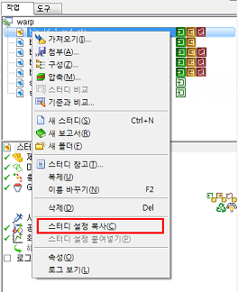- 대상 스터디를 선택한 후 마우스 오른쪽 버튼을 클릭하고 컨텍스트 메뉴에서 스터디 설정 붙여넣기를 선택합니다.