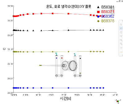 온도, 회로 냉각수(천이) 결과는 사이클 동안 냉각관의 냉각수 온도가 어떻게 변하는지 보여줍니다.