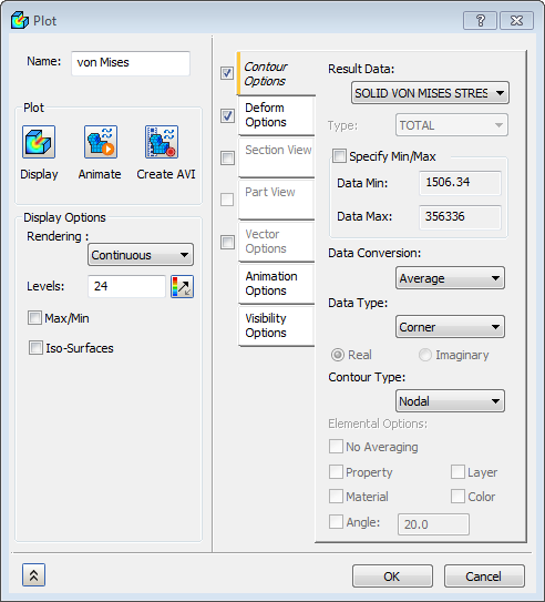- 표시 옵션 아래에서 최대/최소를 선택 취소합니다. 변형 옵션 섹션에서 실제를 선택하여 실제 변위를 표시합니다. 윤곽선 옵션 아래의 결과 데이터를 SOLID VON MISES STRESS로 변경합니다. 가시성 옵션 섹션에서 모두 숨기기를 선택하고 표시를 클릭합니다.