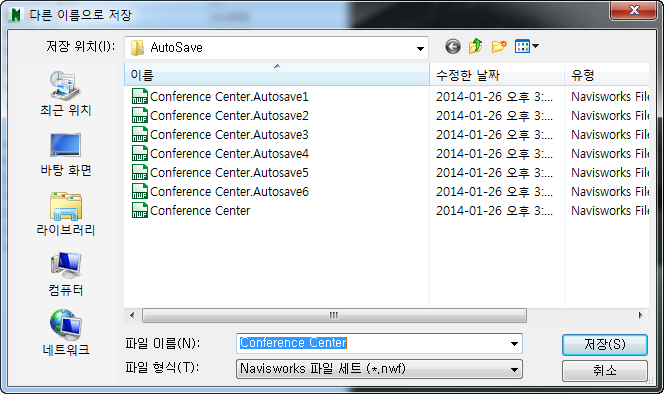 파일 이름을 입력하고, 파일 유형 상자를 사용하여 기본 Autodesk Navisworks 형식(NWF 또는 NWD) 중 하나를 선택한 후 파일 위치를 선택하고 저장을 클릭합니다.