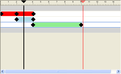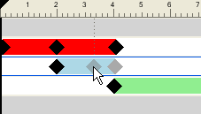 키프레임은 일정에 검정색 다이아몬드로 표시됩니다. 일정 뷰에서 검정색 다이아몬드를 왼쪽 또는 오른쪽으로 끌어 키프레임이 발생하는 시간을 변경할 수 있습니다. 키프레임을 끌면 색상이 검정색에서 더 밝은 회색으로 변경됩니다.