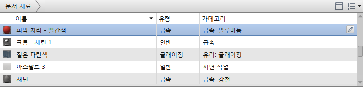 재질 탭을 사용하여 재질을 탐색 및 관리할 수 있습니다.