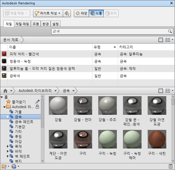 - 문서 재질이 표시되는 순서를 제어합니다. 재질의 이름, 유형 또는 색상을 기준으로 정렬할 수 있습니다. 라이브러리 섹션에서는 범주를 기준으로 정렬할 수도 있습니다.