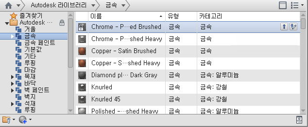 Autodesk에서 제공하는 재질 라이브러리를 관리하거나 특정 프로젝트에 사용할 사용자 라이브러리를 작성할 수 있습니다. 필터 버튼을 사용하여 표시되는 재질, 썸네일 크기 및 표시되는 정보의 양을 변경할 수 있습니다.