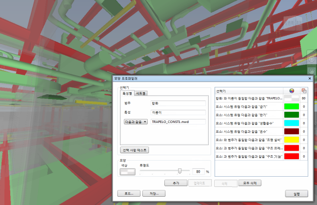 첫 번째 선택기를 사용하여 전체 모형의 색상을 투명도가 80%인 회색으로 재정의하면 다른 색상 재정의가 좀 더 두드러집니다.