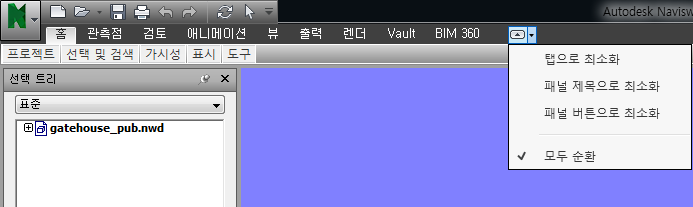 - 모두 순환: 4가지의 모든 리본 상태(전체 리본, 패널 버튼으로 최소화, 패널 제목으로 최소화, 탭으로 최소화)를 순서대로 순환합니다.