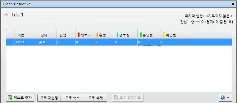 현재 선택한 간섭 테스트의 요약이 항상 Clash Detective 창 맨 위에 표시됩니다. 테스트의 총 간섭 수가 열린 간섭(신규, 활성, 검토됨) 및 닫힌 간섭(승인됨, 확인됨)의 세부 정보와 함께 표시됩니다. 설정 이후에 어떤 식으로든 간섭 테스트가 변경되면(옵션을 변경하거나 모형의 최신 리비전을 로드한 경우 포함) 결과에는 최신 모형 또는 설정이 반영되지 않을 수 있으며 경고(
