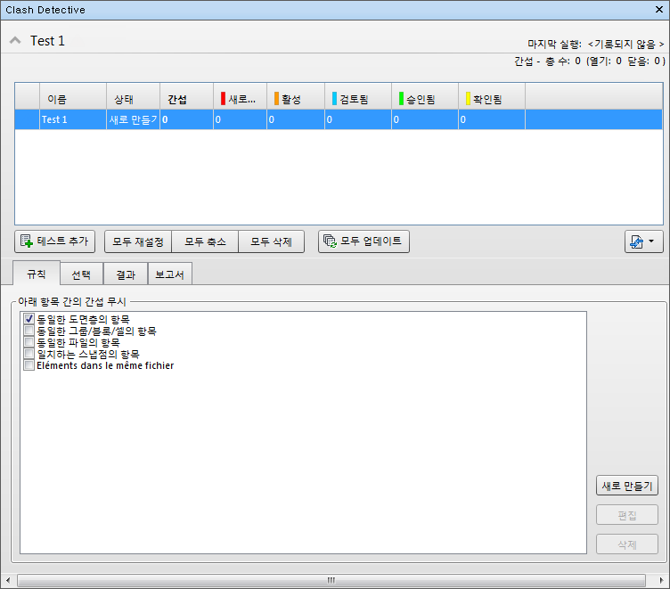 고정 가능한 Clash Detective 창을 사용하면 간섭 테스트에 대한 규칙 및 옵션을 설정하고, 결과를 보고, 결과를 정렬하고, 간섭 보고서를 작성할 수 있습니다.