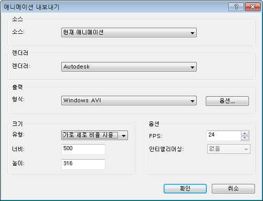 - 애니메이션 내보내기 대화상자에서 나머지 상자를 설정한 다음 확인을 클릭합니다. 자세한 정보는 애니메이션 내보내기 대화상자를 참고하십시오.