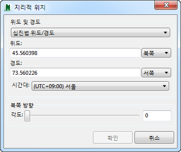 이 대화상자를 사용하여 모형에서 지리적 위치의 위도, 경도 및 북쪽 방향을 설정할 수 있습니다. 장면 뷰에는 사용자화된 표준 시간대의 사용자화된 태양 위치가 표시됩니다.