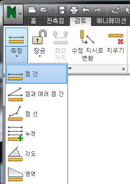 측정 도구를 사용하면 모형에 있는 항목의 점 사이에서 측정할 수 있습니다. 모든 측정은 표시 단위로 수행됩니다. 측정 도구는 검토 탭 측정 패널에 있습니다.