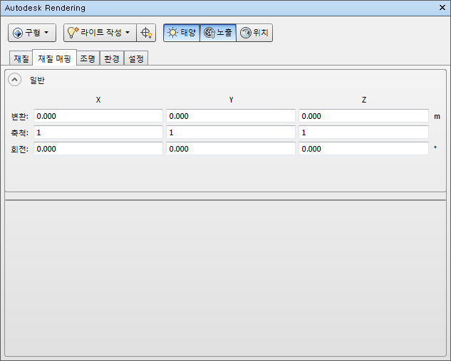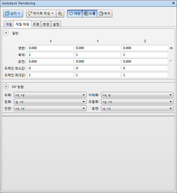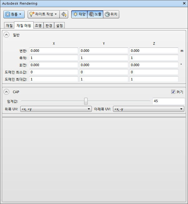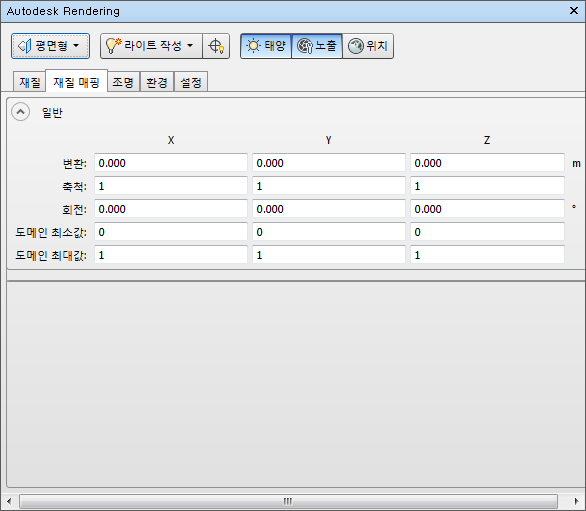 재질 매핑은 3D 좌표와 법선이 2D 텍스처 좌표(UV)로 변환되는 방식을 정의합니다. 이와 같이 변환된 좌표는 텍스처 맵에서 색상 등을 조회하는 데 사용됩니다. 각각의 특정 매핑은 매핑을 수행하는 방법에 대한 서로 다른 '레시피'를 나타냅니다. 일반 섹션의 변환, 축척 및 회전 필드는 3D 점을 텍스처 좌표로 변환하는 각 특정 매핑 유형의 레시피를 적용하기 전에 각 3D 좌표 및 법선에 적용되는 변환을 정의합니다. 도메인 최소값 및 도메인 최대값 필드의 값은 많은 매핑 레시피에서 좌표 공간(X, Y, Z) 맵의 범위(각 좌표에 대한 텍스처 공간에서 최소값 0과 최대값 1 사이로 지정)를 결정하는 데 사용됩니다.