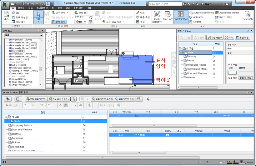 백아웃 기능을 사용하여 형상 조각을 절단합니다. 백아웃을 그려 기존 영역 테이크오프 조각을 제외시킵니다. 백아웃은 예를 들어 테이크오프의 바닥 영역 위에 표식을 지정했지만 테이크오프에서 복도와 같은 해당 영역의 단면을 제외하려는 경우 유용합니다. 그러면 복도 백아웃 영역이 Quantification 통합 문서의 바닥 영역에서 "빠집니다".