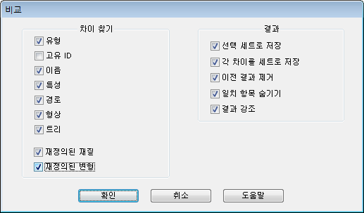 비교 대화상자의 차이 찾기 영역에서 필요한 모든 옵션의 확인란을 선택합니다.