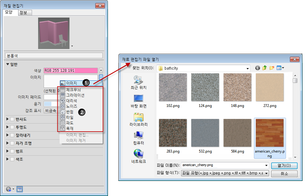 재질의 색상에 텍스처를 할당할 수 있습니다.