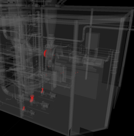 간섭에 관련되지 않은 모든 항목을 흐리게 나타내려면 격리 드롭다운 리스트에서 기타 항목 흐리게를 선택합니다. 간섭 결과를 클릭하면 Autodesk Navisworks에서 간섭에 관련되지 않은 모든 항목을 회색으로 바꿉니다.