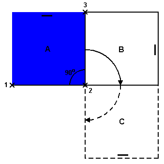 이 다이어그램에서는 선택한 객체(위치 A)의 회전 방법을 보여 줍니다. 첫 번째 점에서 두 번째 점(1에서 2) 사이의 선과 두 번째 점에서 세 번째 점(2에서 3) 사이의 선은 객체의 회전 각도(예: 90도)를 정의합니다. 두 번째 점(2)은 회전 중심점으로 사용됩니다.