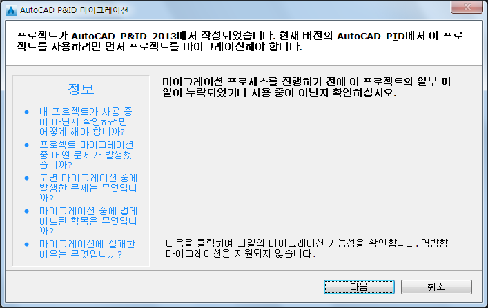 프로젝트 마이그레이션 시작 페이지에서는 AutoCAD Plant 3D에서 열려는 프로젝트가 마이그레이션에 적합한지를 알려 줍니다. 마이그레이션하기 전에 프로젝트 및 모든 관련 도면 파일을 닫아야 합니다.