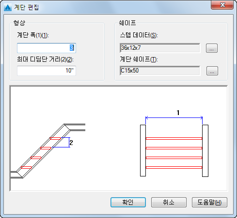 재료 표준, 유형 및 크기와 같은 계단 쉐이프 옵션을 계단 쉐이프 선택 대화상자에 정의된 대로 지정합니다.