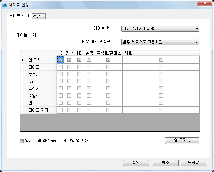 BOM 테이블 유형 및 열을 구성합니다.