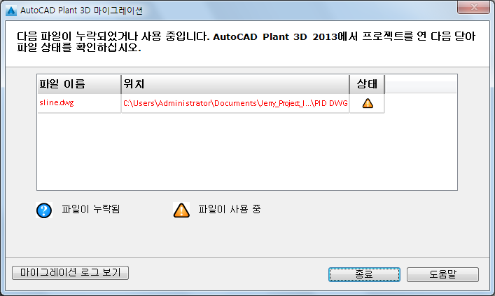 프로젝트 및 관련 도면이 사용 가능하고 잠길 때까지 AutoCAD Plant 3D로의 마이그레이션을 진행할 수 없습니다.