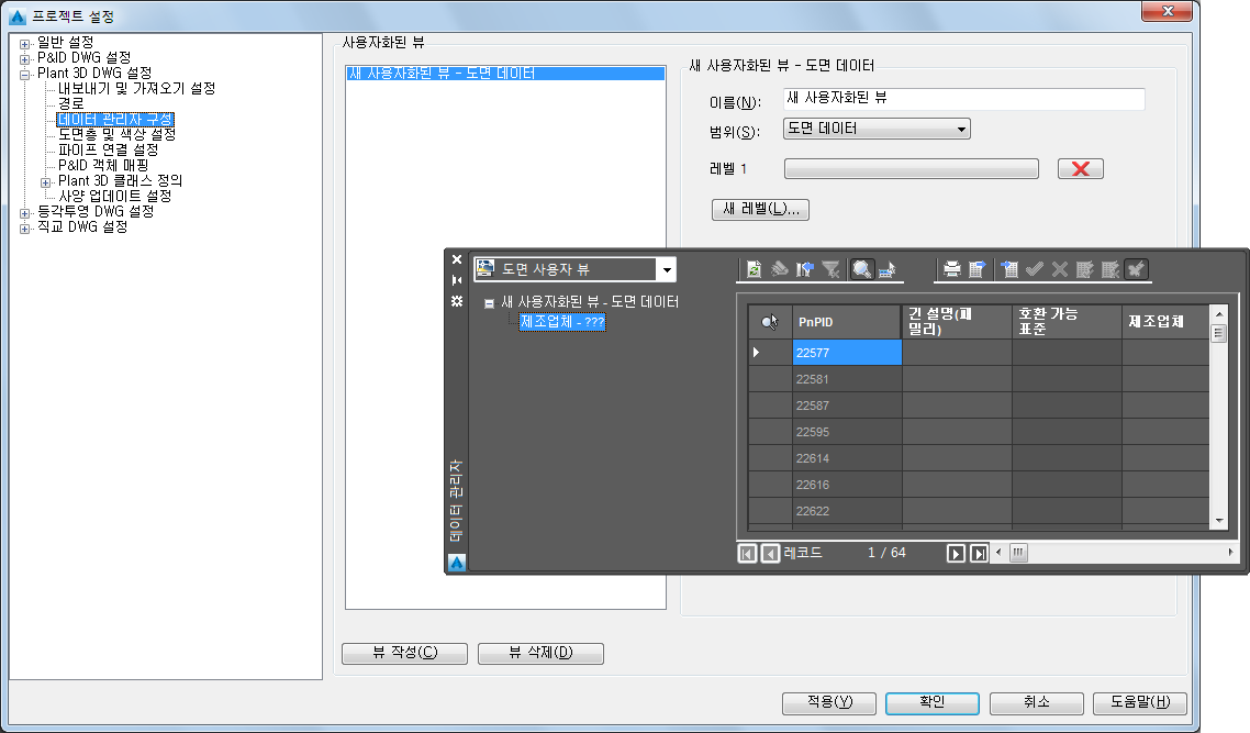 데이터 관리자에서는 프로젝트, 도면, 내장 보고서 등 다양한 방법으로 데이터를 볼 수 있습니다.