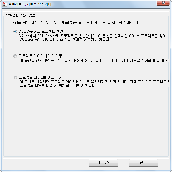 명령 입력: 프로그램 폴더의 PnPProjectMaintenance.exe기본 데이터베이스(SQLite)에서 SQL Server로 프로젝트를 변환할 수 있습니다. 또한 SQL Server 데이터베이스를 다른 데이터베이스 이름 또는 서버로 복사하거나 이동할 수 있습니다.