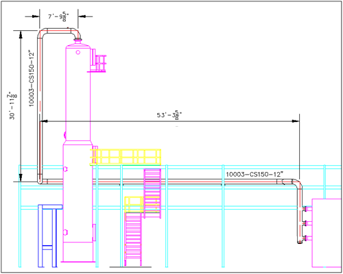직교 도면에는 Plant 3D 모형에 있는 파이프, 밸브, 장비 및 구조용 강의 2D 뷰가 표시됩니다. 주석, 치수, 매치 선(평면도만), 파이프 간격 등을 포함할 수 있으며, 선 및 객체를 표시하거나 숨길 수 있습니다. 다음은 단일 뷰가 표시된 예입니다.