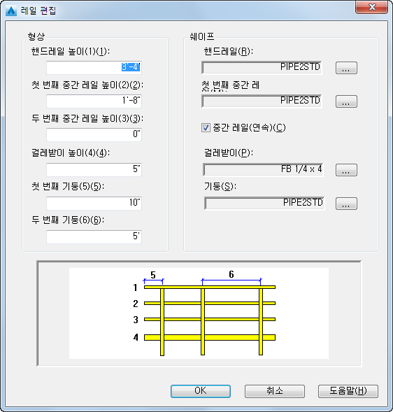 재료 표준, 유형 및 크기와 같은 핸드레일 쉐이프 옵션을 핸드레일 쉐이프 선택 대화상자에 정의된 대로 편집합니다.