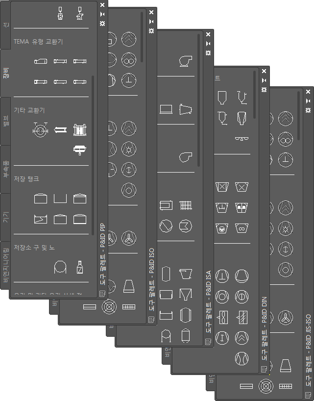 도구 팔레트 제목 표시줄을 마우스 오른쪽 버튼으로 클릭하고 도구 팔레트를 선택하여 다른 도구 팔레트로 전환할 수 있습니다. 그러나 하나의 표준에서 사용할 수 있는 모든 P&ID 기호가 다른 표준에서 동일한 것은 아닙니다.