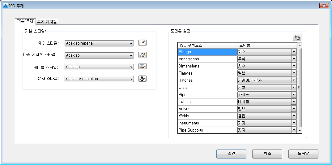 각 ISO 구성요소를 표시할 도면층을 지정합니다.