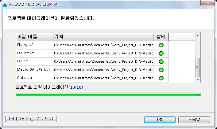 마이그레이션 프로세스는 프로젝트의 크기 및 연관된 도면 수에 따라 시간이 많이 소요될 수 있습니다. 마이그레이션 진행률 테이블에 성공하거나 실패한 파일 마이그레이션이 보고되고 마이그레이션 진행률이 표시됩니다. 모든 파일이 성공적으로 마이그레이션되면 AutoCAD Plant 3D에서 프로젝트가 열립니다.
