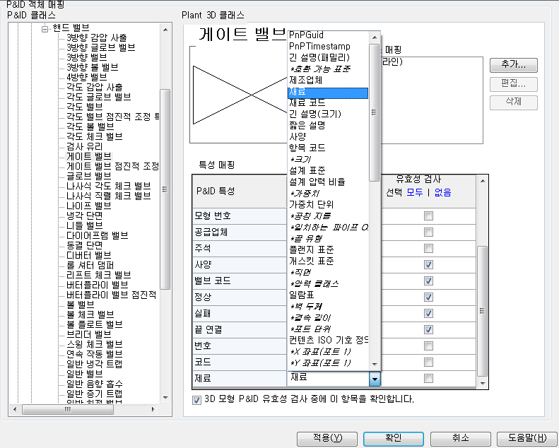 - P&ID 객체 매핑 창의 P&ID 클래스 아래에서 트리를 확장하고 특성을 추가한 P&ID 객체(예: 밸브)를 클릭합니다.