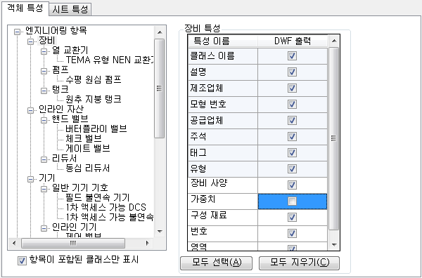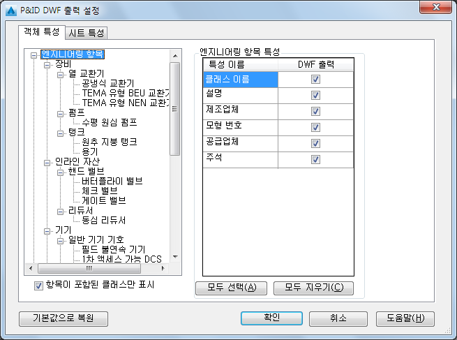 3. 출력 설정 대화상자의 객체 특성 탭에서 항목이 포함된 클래스만 표시 확인란을 선택합니다.