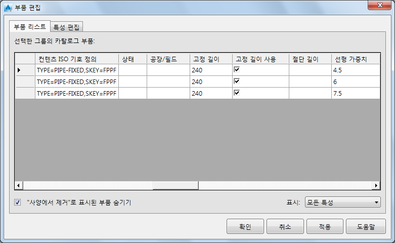 사양 편집기를 사용하여 프로젝트의 파이프 사양에서 고정 길이 사용 및 고정 길이 특성을 설정할 수 있습니다. 새 고정 길이 파이프 라우팅 기능을 사용하도록 고정 길이 특성을 설정해야 합니다.