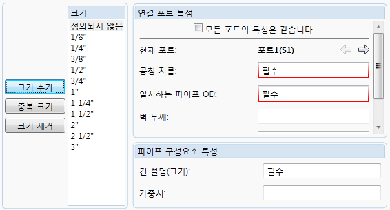 - 오른쪽 화살표를 클릭하고 추가 포트에 대한 공칭 지름 및 일치하는 파이프 OD를 입력합니다.