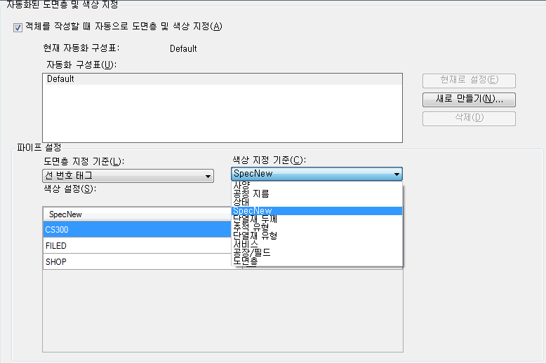 - 자동화된 도면층 및 색상 지정 창의 색상 지정 기준 리스트에서 새 항목을 클릭합니다.