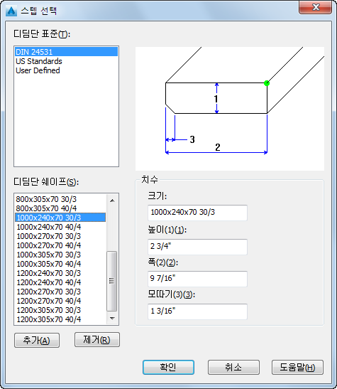 계단의 디딤단 표준, 디딤단 쉐이프 및 치수를 지정합니다.