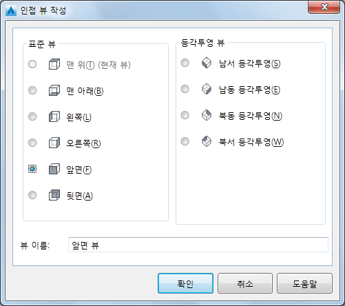 인접 뷰에 대한 표준 맨 위, 맨 아래, 왼쪽, 오른쪽, 앞쪽 또는 뒤쪽 직교 뷰를 지정합니다.
