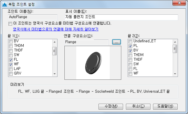 이 열의 확인란을 선택하면 조인트가 영국식(ANSI)에서 미터법(DIN)으로의 연결 구성요소를 연결하도록 지정됩니다.