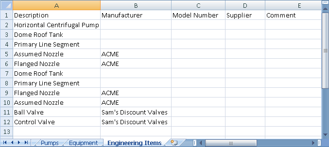 각 워크시트 또는 CSV 파일에는 각 Plant 객체에 대한 행과 각 특성(예: PnPID 번호, 설명, 제조업체)에 대한 열이 포함됩니다.