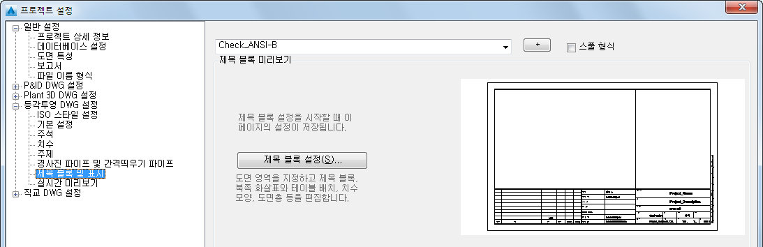 프로젝트 설정 트리 뷰에서 등각투영 DWG 설정을 확장합니다. 제목 블록 및 표시를 클릭합니다.