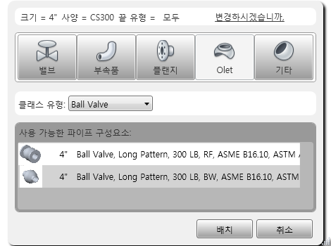 배치할 구성요소를 지정합니다. 현재 사양, 크기, 끝 유형 및 클래스 유형과 일치하는 파이프 구성요소 리스트를 표시합니다.