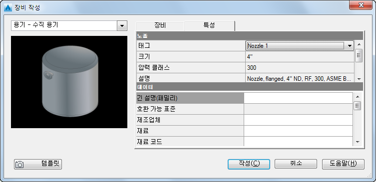 노즐 정보를 표시하고 새 장비 모형에 대한 데이터 특성을 설정합니다.